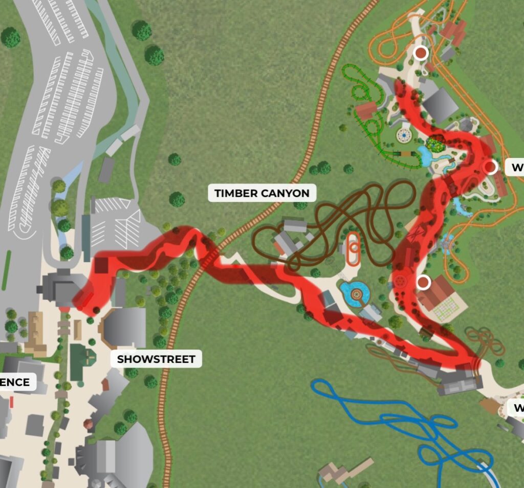 Continue down the hill and turn left onto Showstreet. If you’d like take an indoor break, go to a show at the Palace or Dreamsong theaters. Check the app for show schedules. Or you could explore the Dolly Parton Experience area to learn more about Dolly!