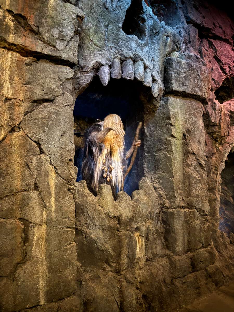 Queue: Indoors, air-conditioned, and well themed! But the theming is pretty scary. It’s dark, there are lots of skulls, and one room has a scary animatronic of a witch doctor (pictured). The Express lane and the single rider lane will skip some of the scary parts!
