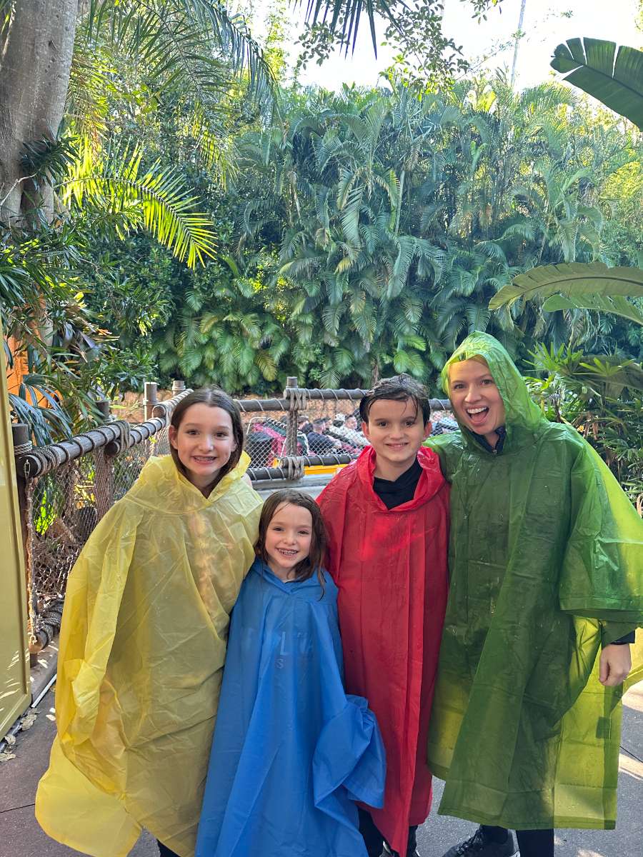 - Ponchos or packable rain gear. These family packs are great. Waterproof shoe covers are also helpful to take with you if there’s rain in the forecast. Ponchos and shoe cover can also be worn on the water rides if you don’t want to get too wet.