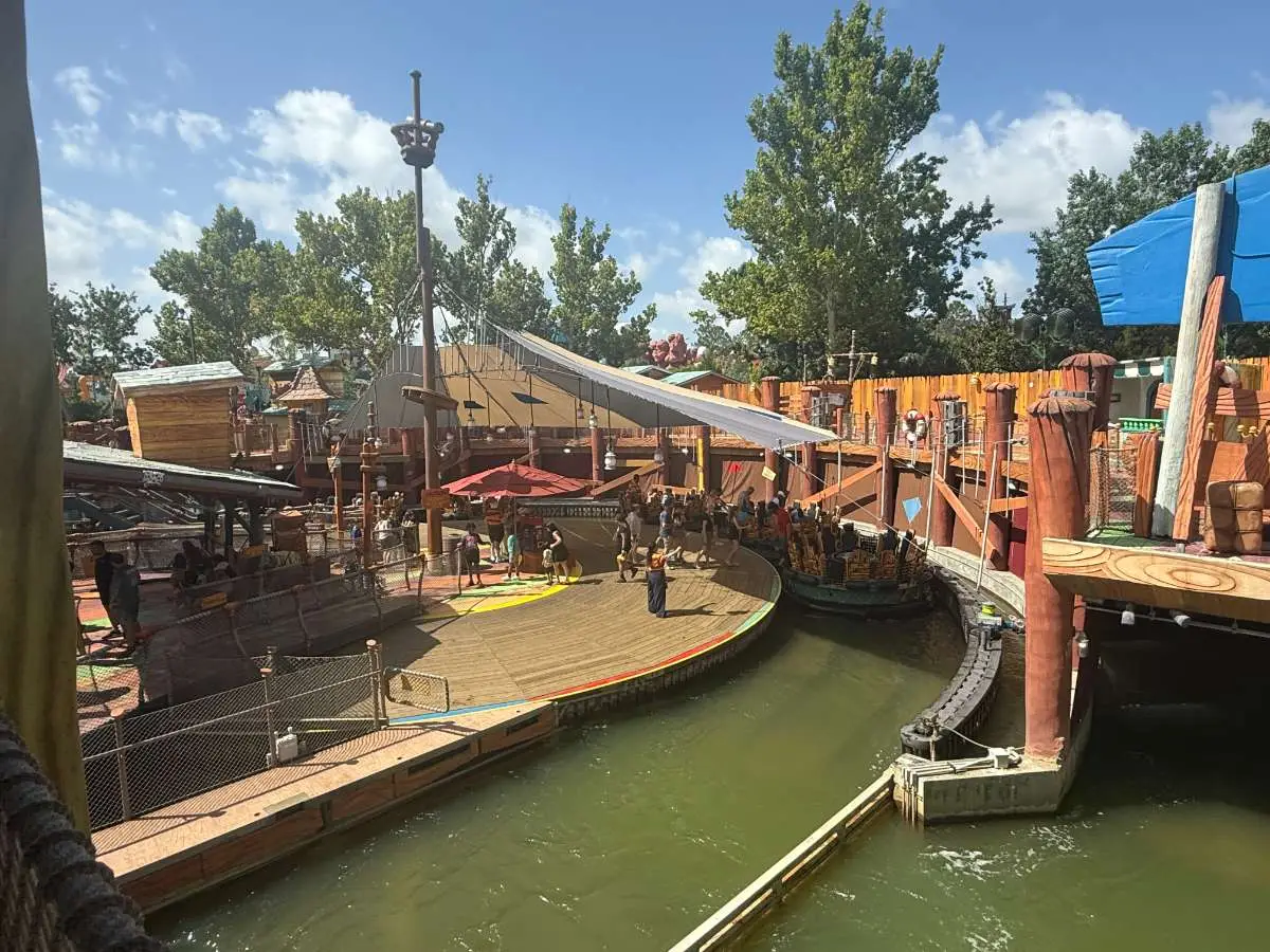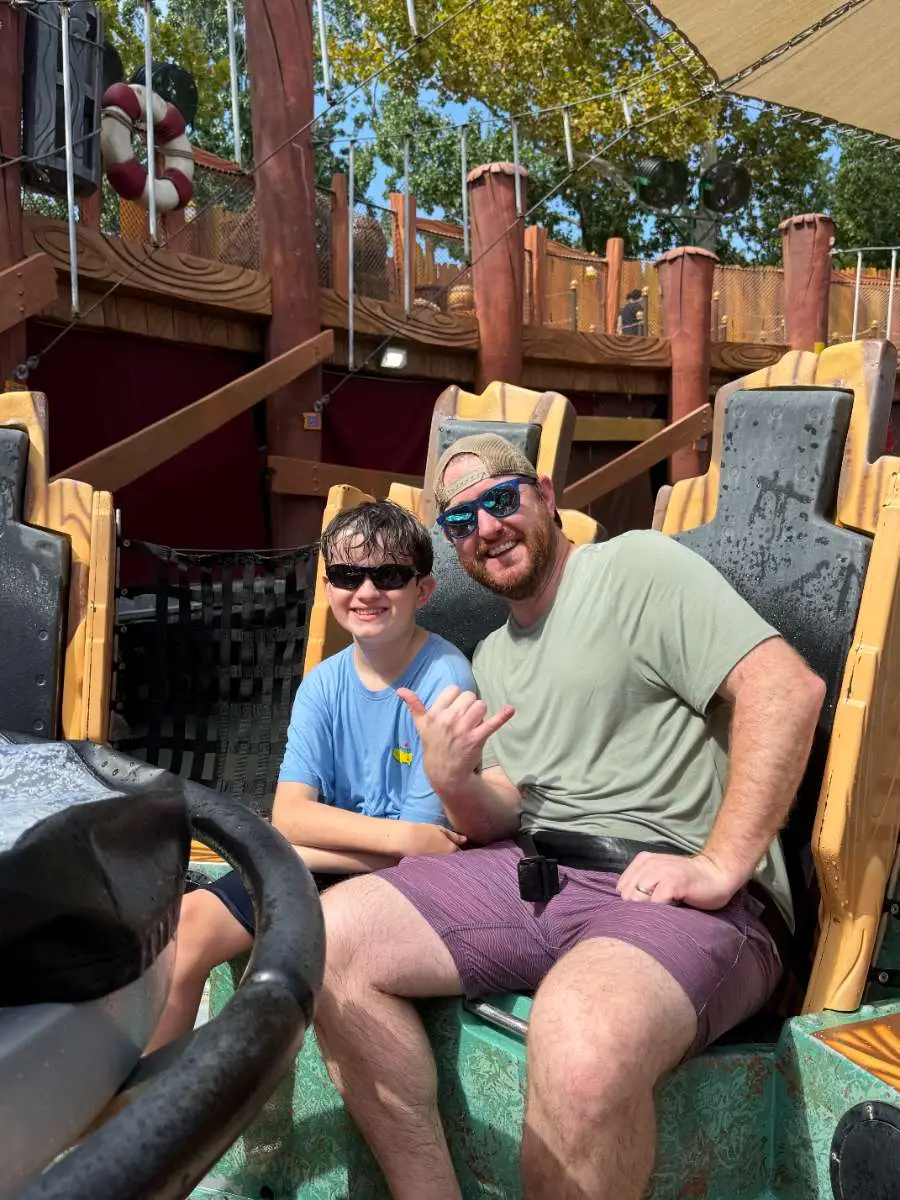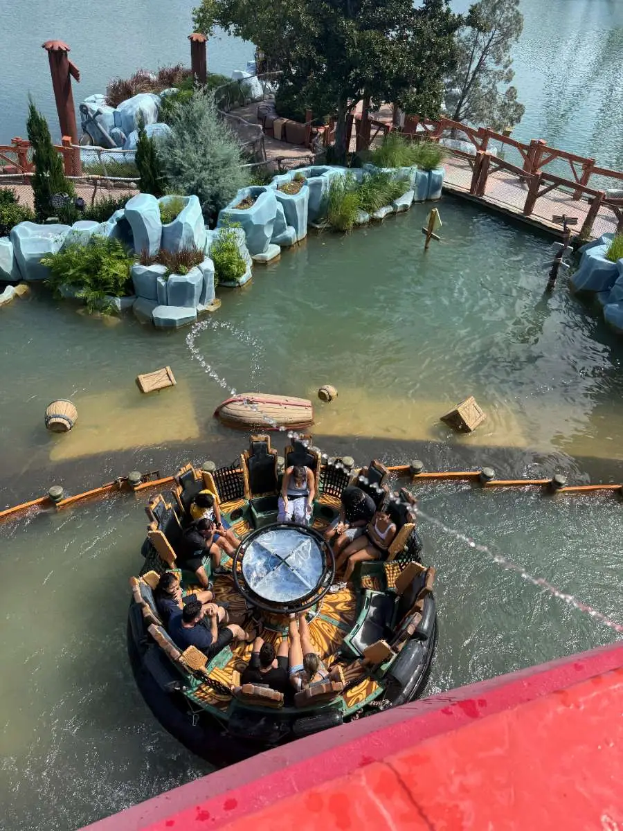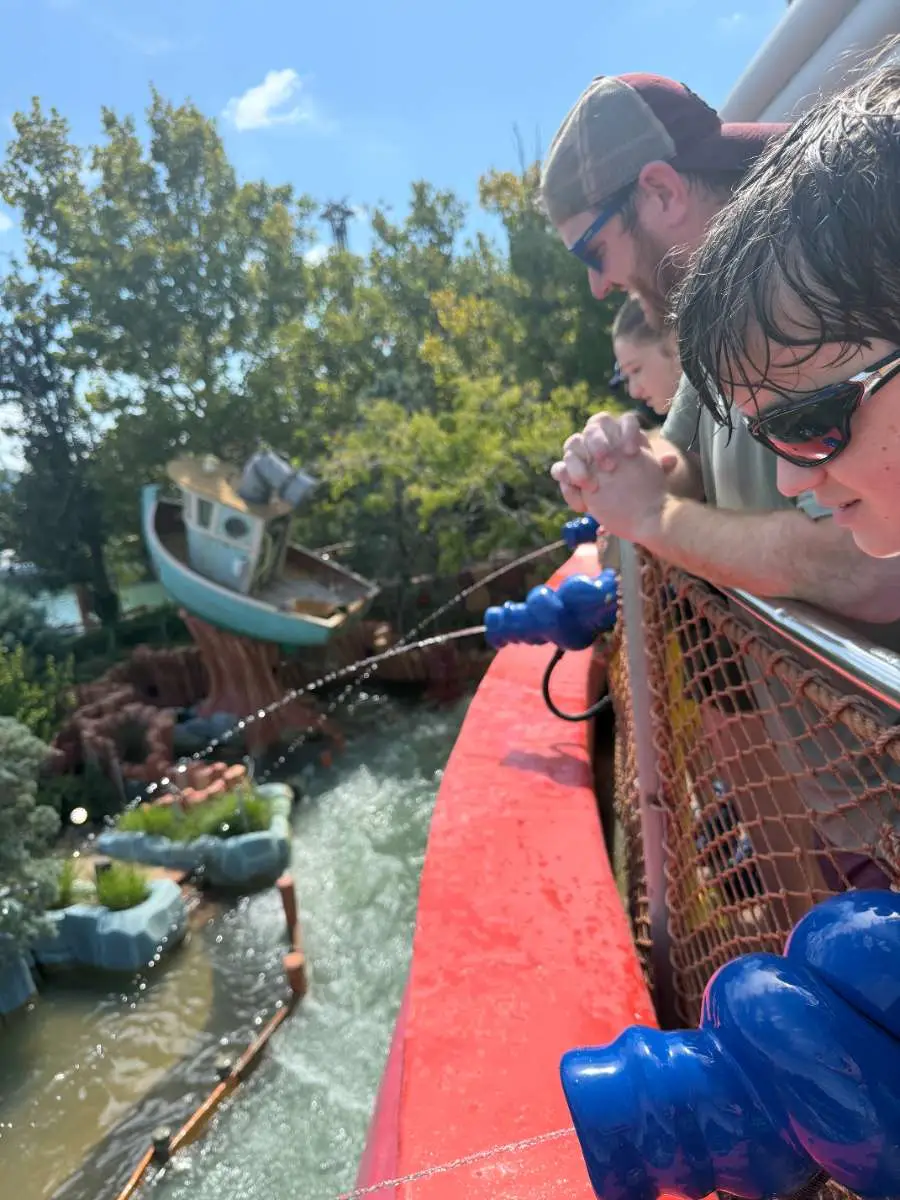 Tip: The front row gets the most wet! The back row and people on the sides will get a bit wet also. If you want to avoid getting wet, sit in middle of one of the middle rows. You do not get AS wet on this one as on Dudley Do-Rights and Popeyes Barges. We’ve done this one during colder months wearing a poncho and have been ok – but wear a longer poncho that covers your butt when you sit and has a drawstring around your head.