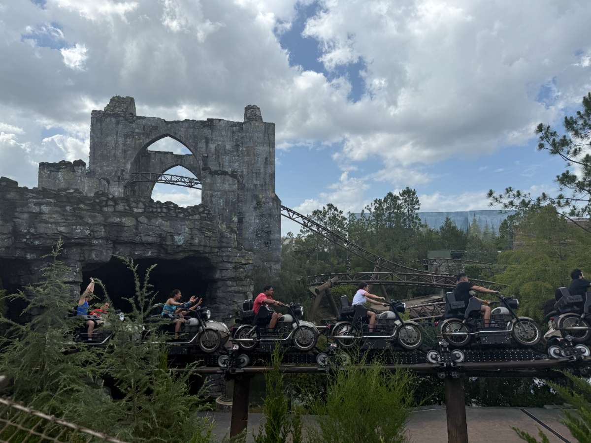 Queue: It’s really long but quite lovely! It weaves inside and outside through landscapes areas and different buildings themed to look like buildings around Hogwarts grounds. The final room has a lit ceiling where you can see and hear the shadow of Hagrid riding around on his motorbike. Having different areas to go through keeps the line feeling shorter and more managable. When you finally reach the end, they will put you in pairs and ask you who is riding on the motobike and who will ride in the sidecar. Make sure you’ve already discussed this with your group. Then you walk out onto a moving platform, the motorbike rider climbs over the sidecar and sits down, then the sidecar person enters. The ride never stops entirely unless for people with disabilities that need extra help.