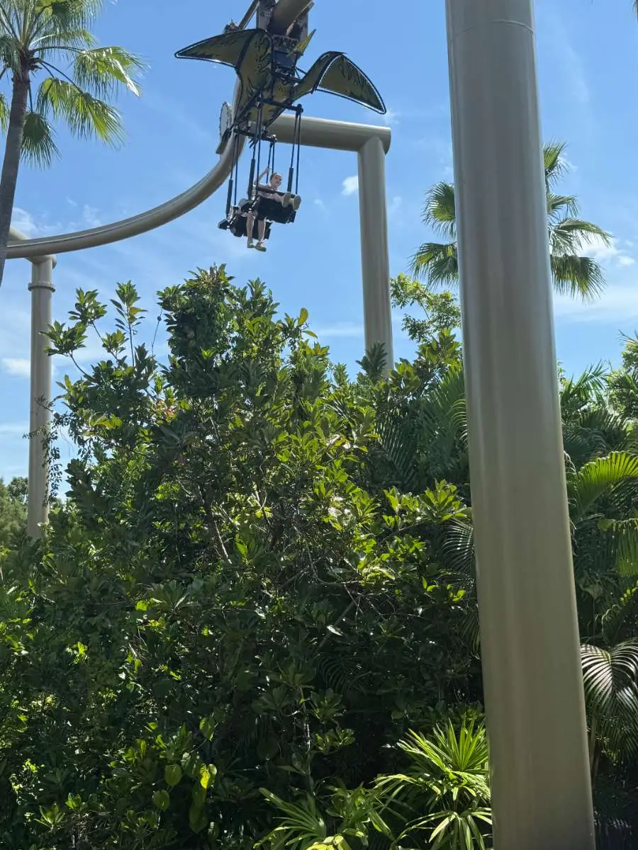 Description: This is a kids ride inside the Camp Jurassic play area. 2 people sit in swings that dangle beneath a pteranodon as you soar over Camp Jurassic on a track above you. It’s fun and you get nice views, but it’s too short and loads slowly.