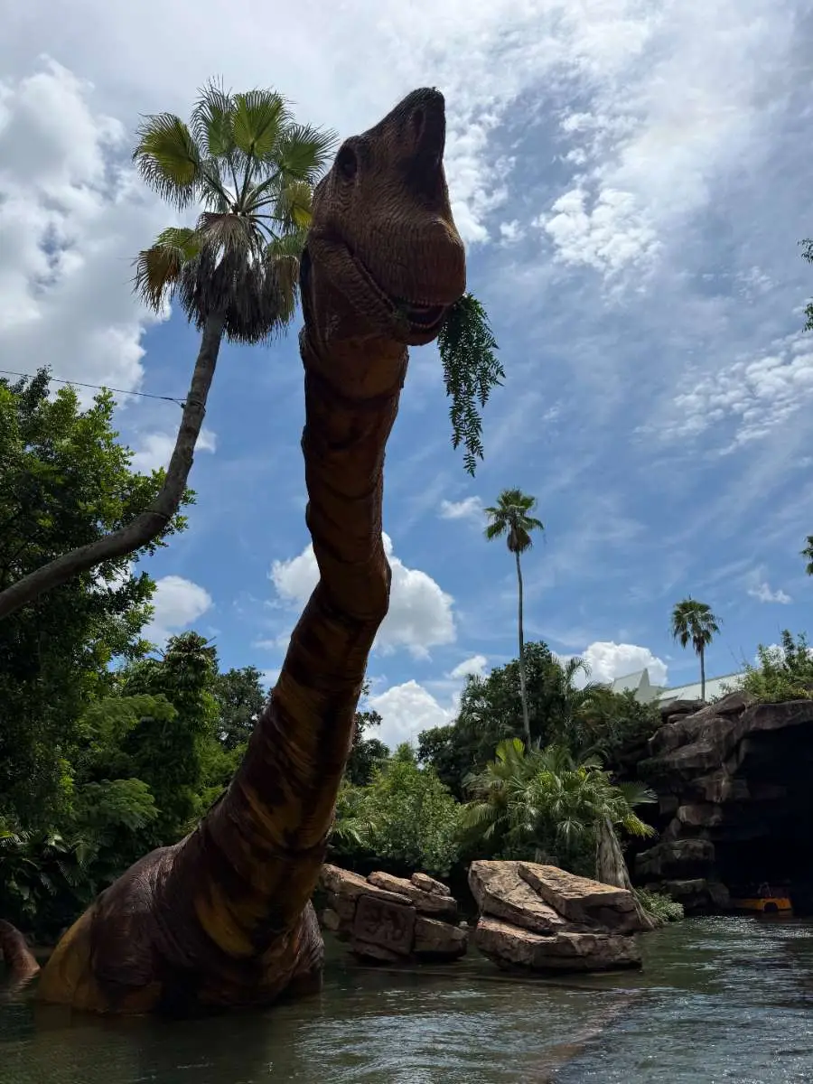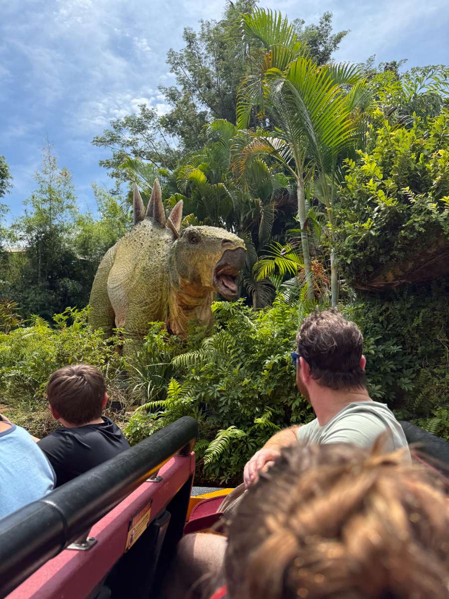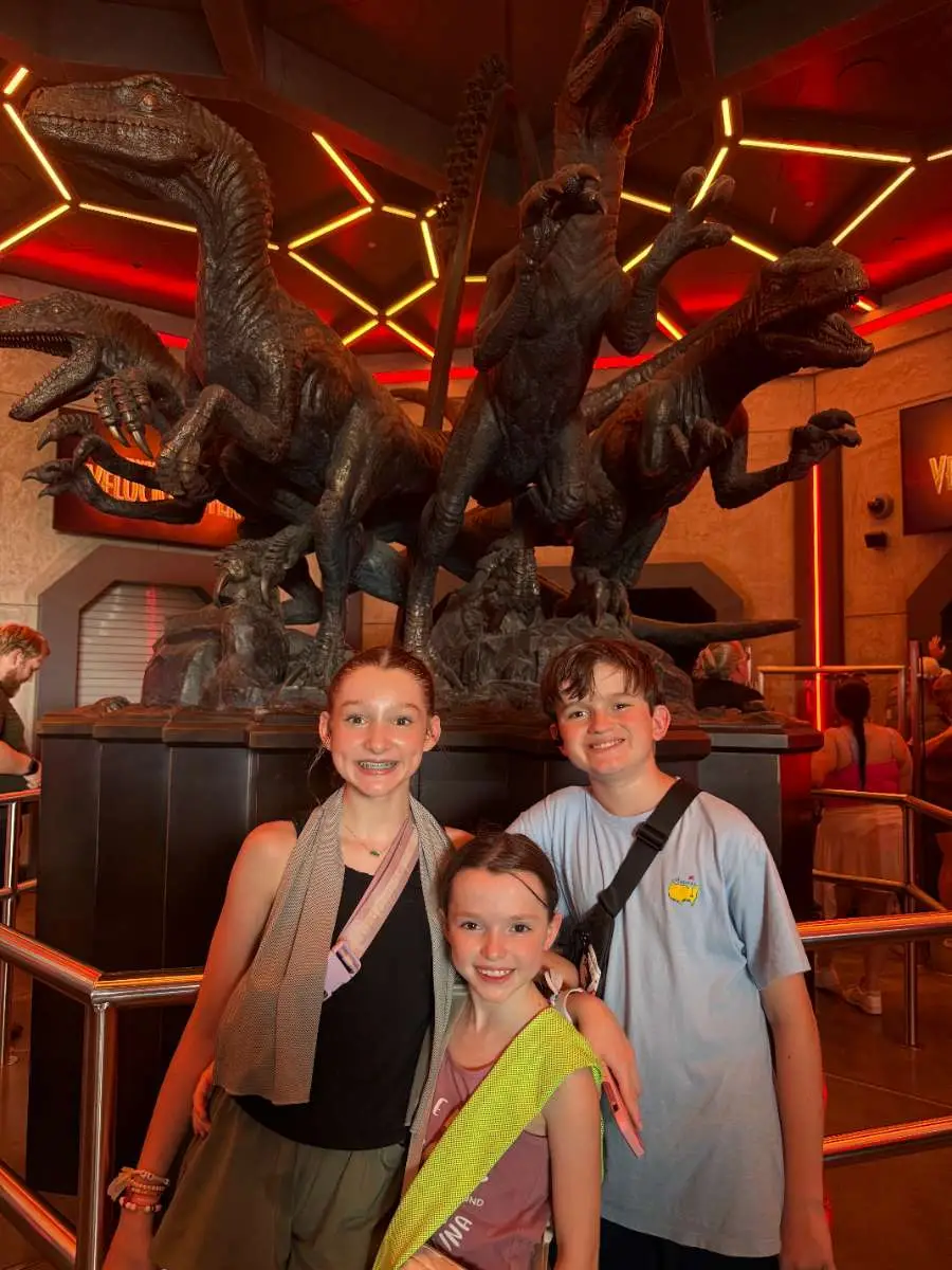 Queue: When the wait is longer the first part of the queue is outside by covered, then you enter an open-air room with an impressive statue of the 3 raptors in the center and then into indoor queue areas. You will come to the locker room where you’ll want to be ready to put your things into a locker quickly.