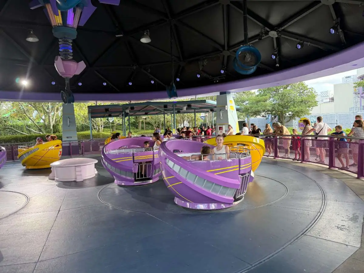Ride Vehicle: Saucers that seat 1-5 people in a circle with a turning wheel in the center, similar to the teacups at Disney parks.