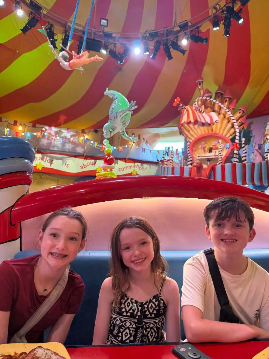 - Circus McGurkus Cafe – a fun Dr. Seuss-themed restaurant with the train ride running through it! They have several unqiue food options like poke bowls, meatballs in a garlic bread cone, burgers, pizza, salmon, and more. Be sure to mobile order before you get there and save time!