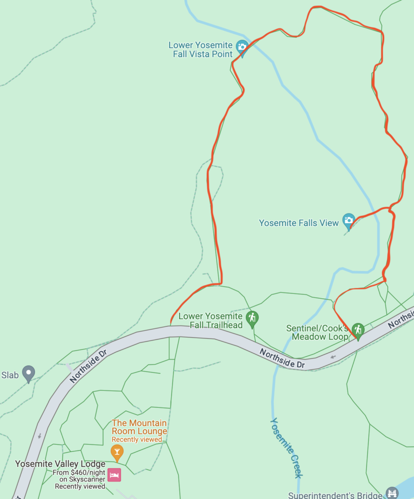 From the Visitor’s Center, follow the map below to Cook’s Meadow Loop. This flat trail will give you great views of the Valley, Yosemite Falls (if it has water), and the Merced River. You can catch a bus near the Yosemite Falls trail back to the campground if your car is there.